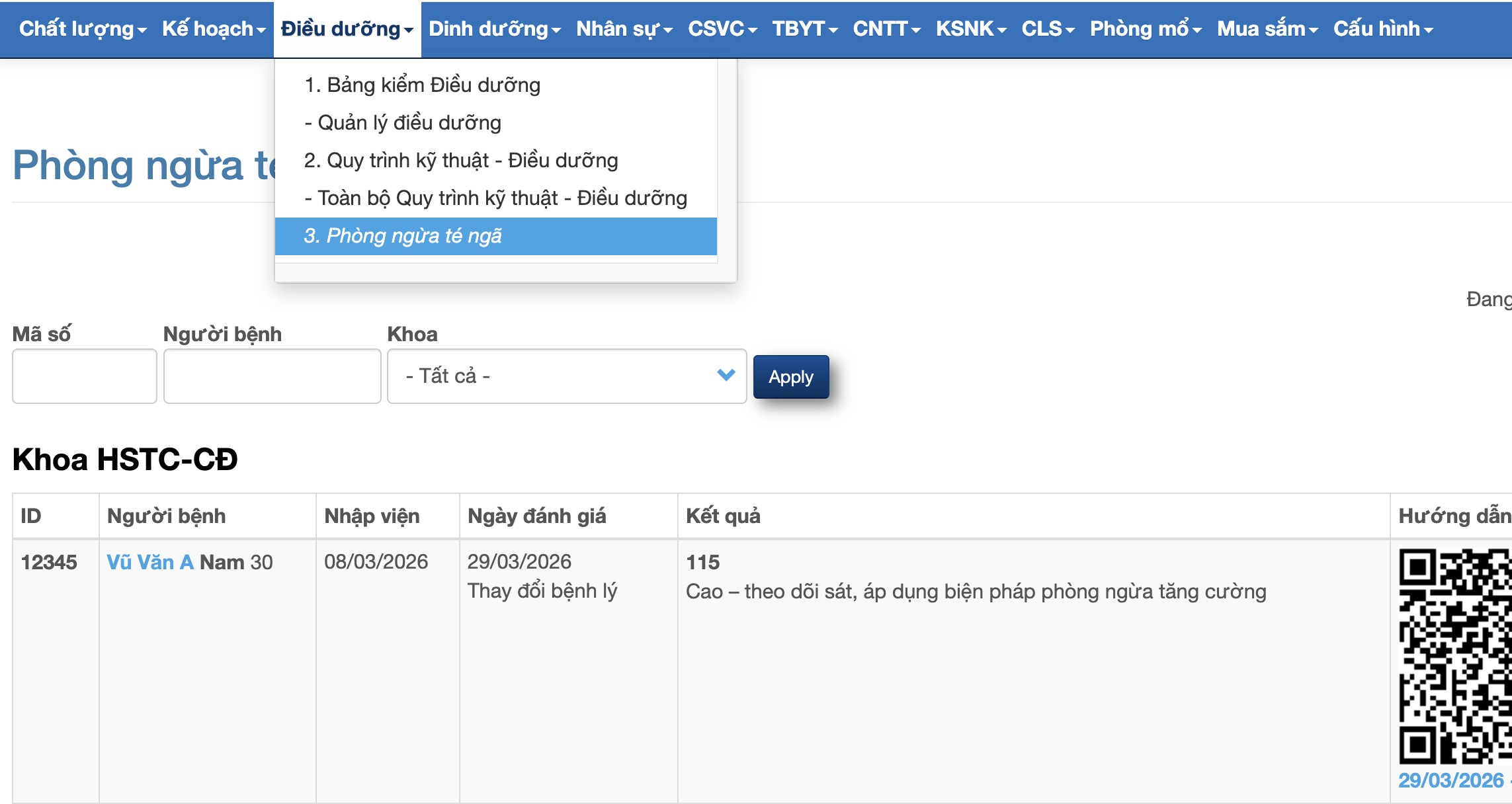 Hướng dẫn này áp dụng cho bệnh viện triển khai chức năng Phòng ngừa té ngã trên phần mềm.