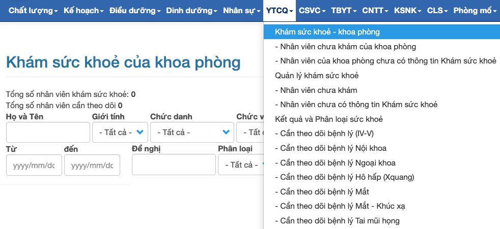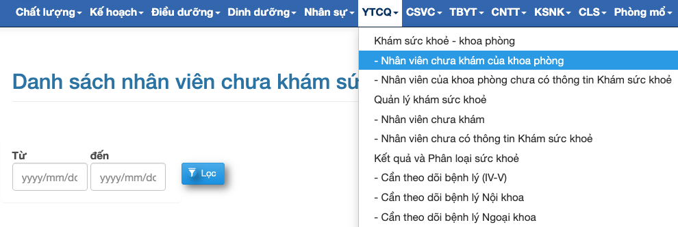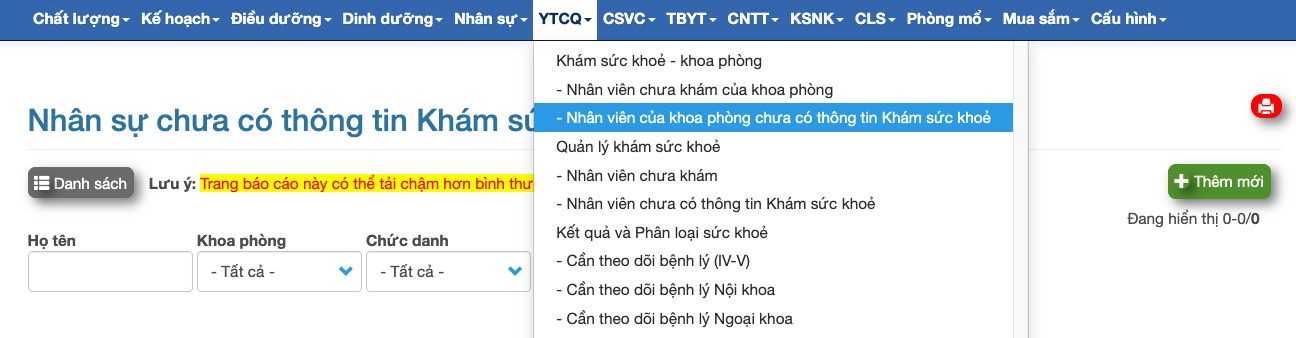 Click "YTCQ" --> "Nhân viên của khoa phòng chưa có thông tin khám sức khỏe".